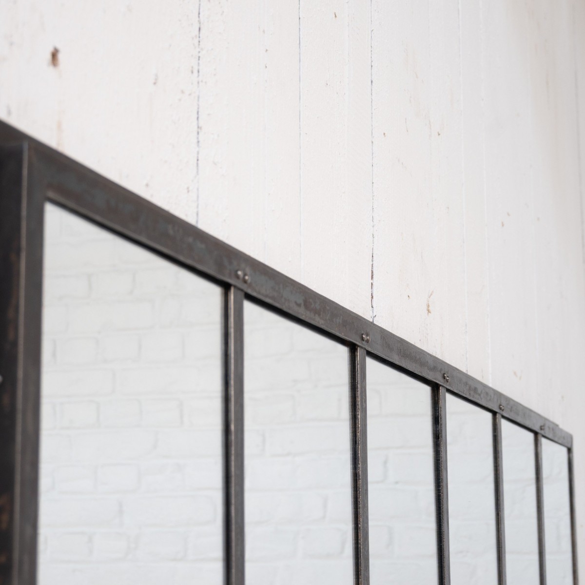 Riveted metal mirror with a clean, simple form.