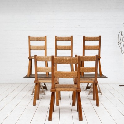 Set of 6 elm structure chairs with straw seats and backs FRANCE circa 1960.
