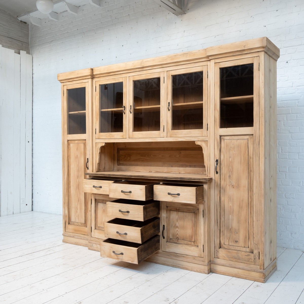 It features six drawers and seven doors, including five glazed and two solid panels.