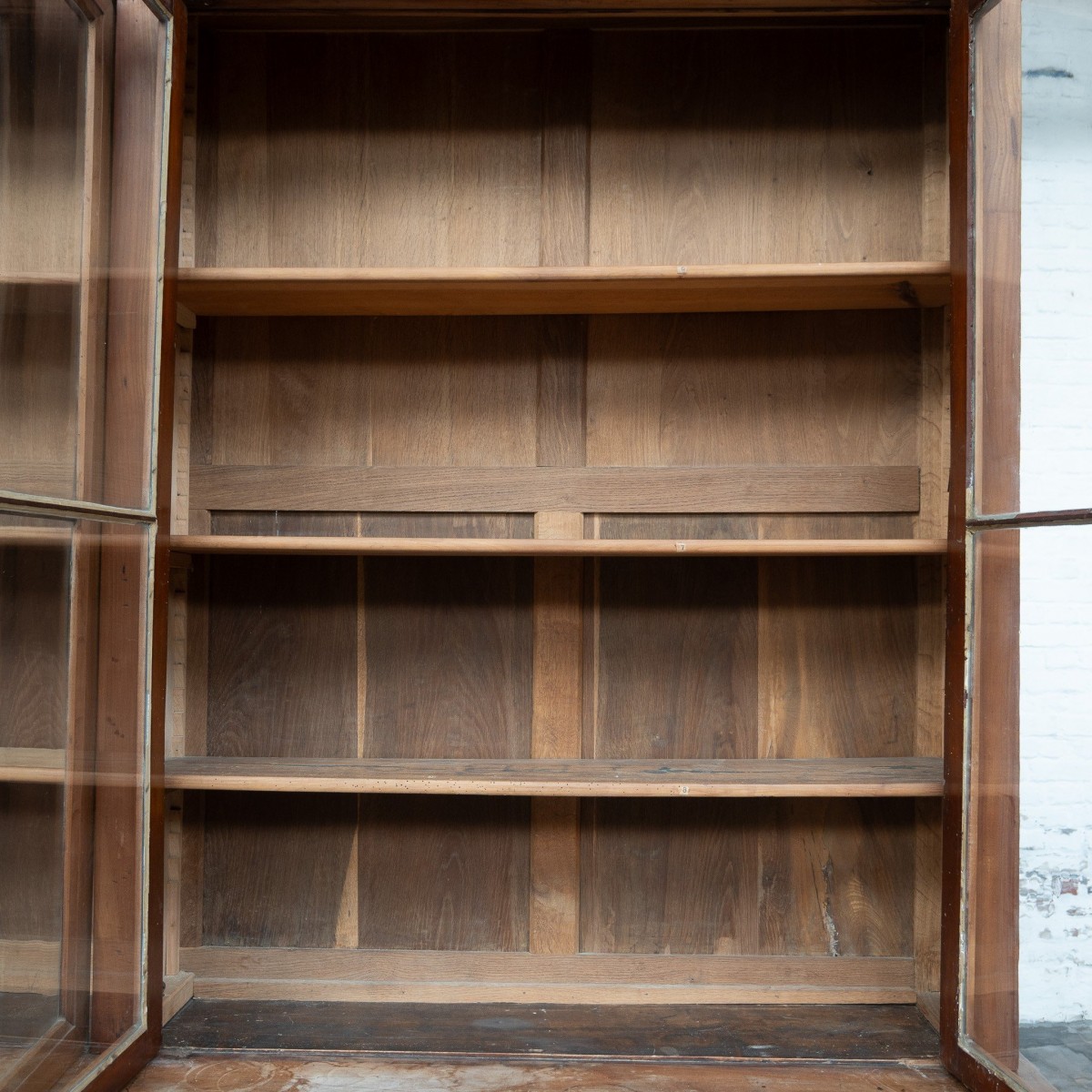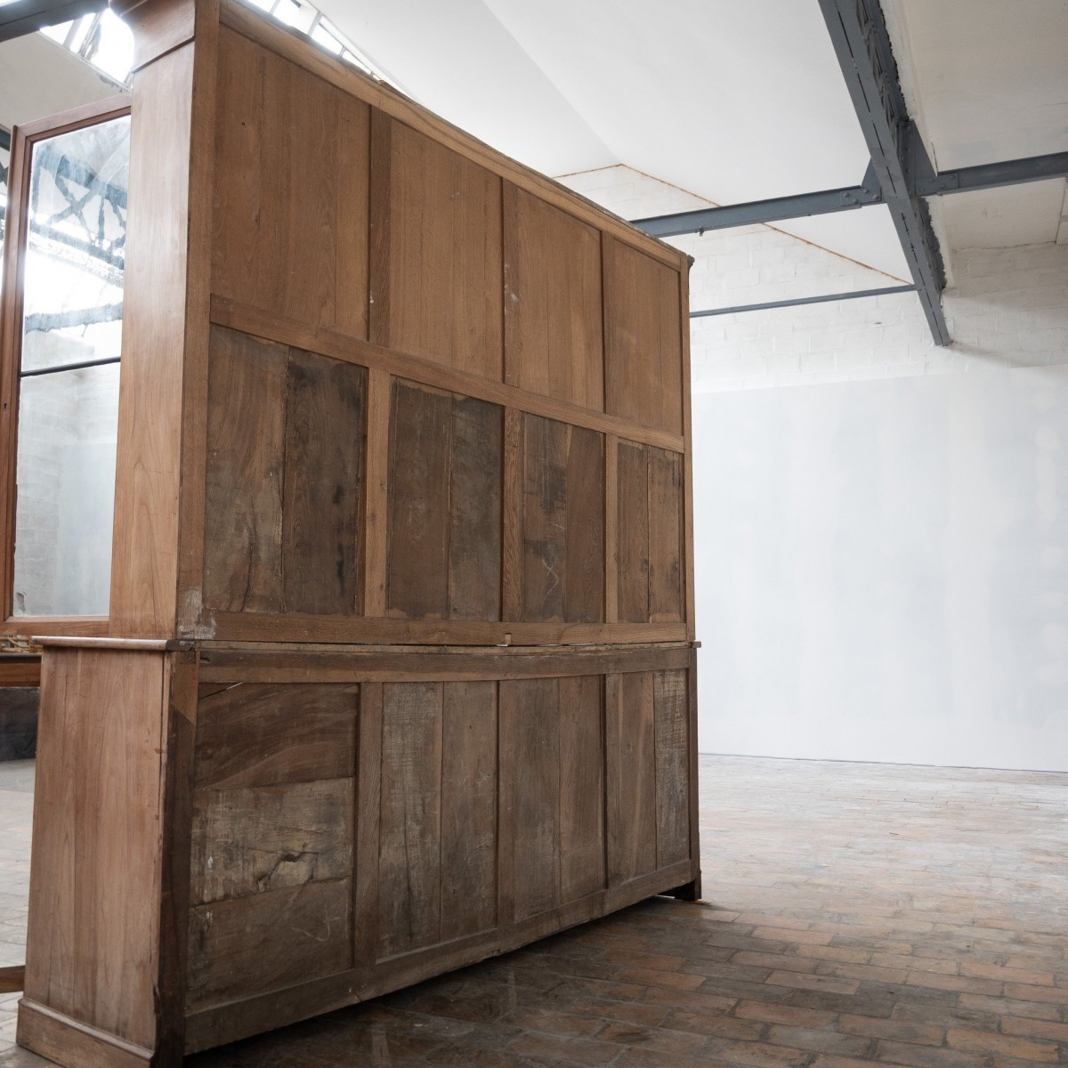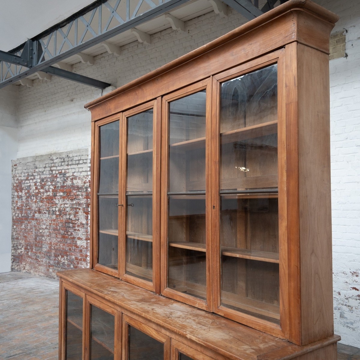 The cabinet is built in two sections, making transport and installation easier. It features a 92 cm counter height with a 30 cm overhanging top, typical of early 20th century display furniture.