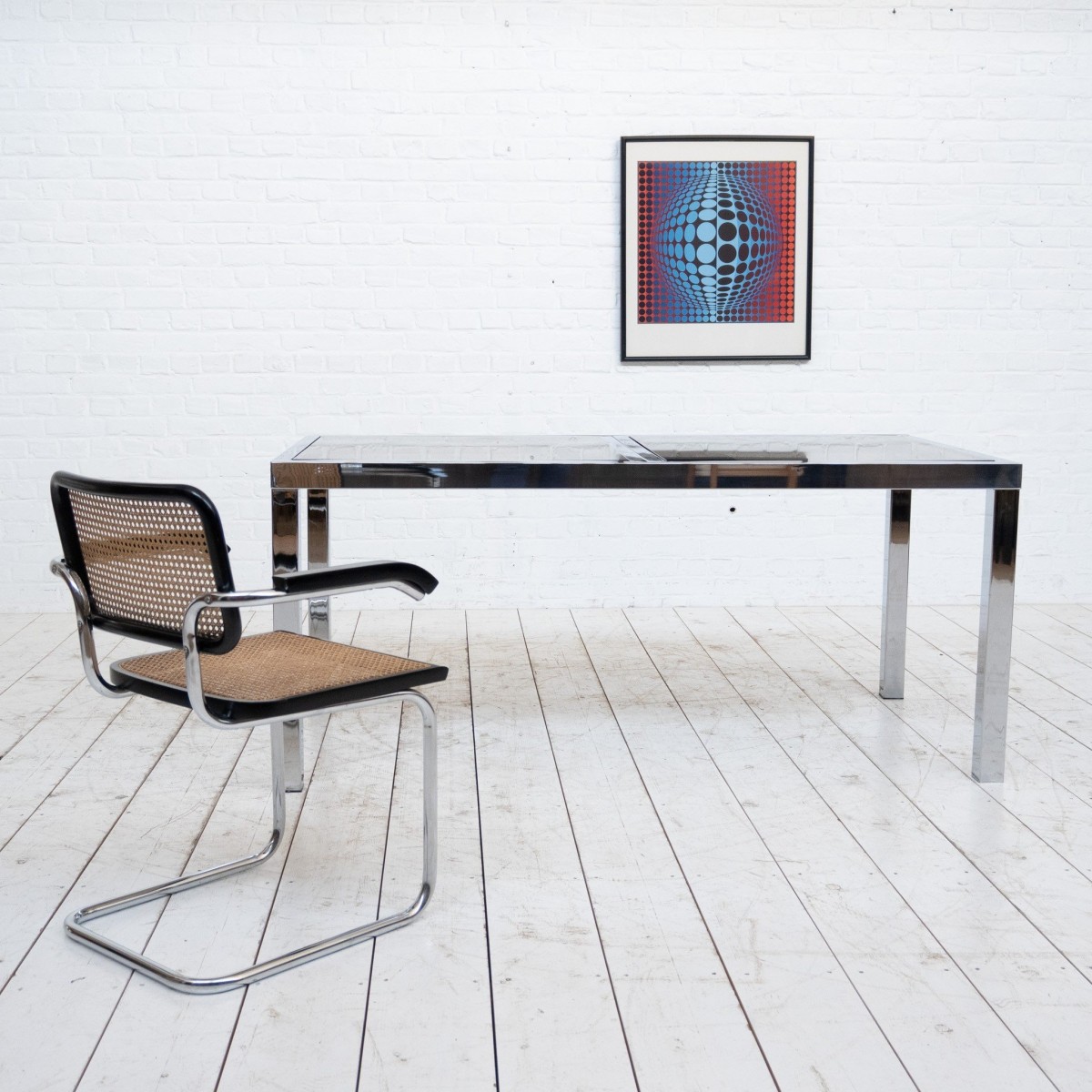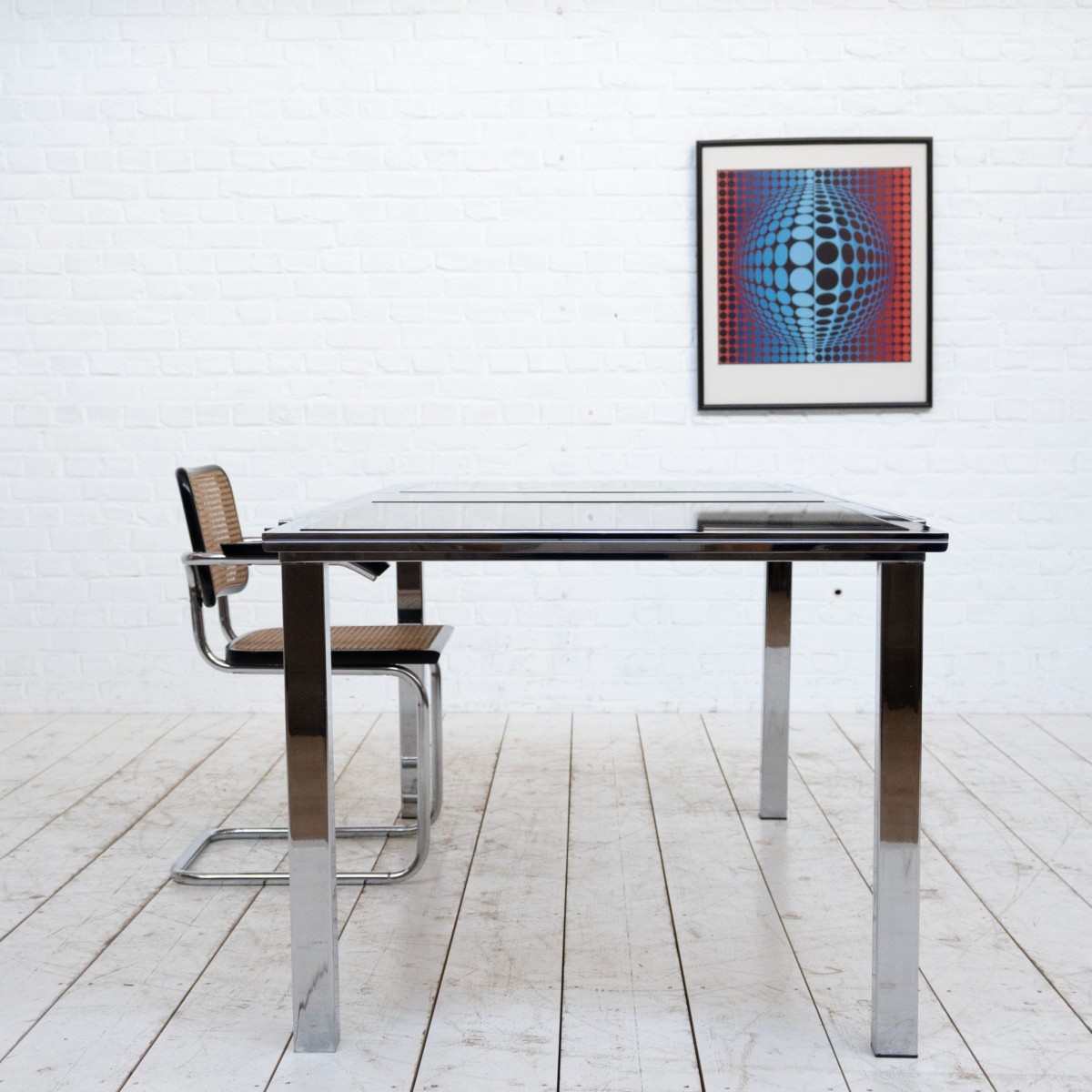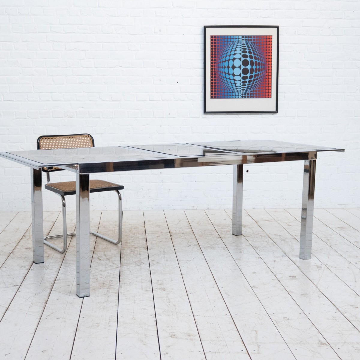 Grande table de repas extensible en acier chromé et verre fumé, design des années 70.