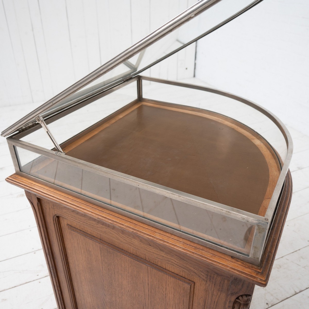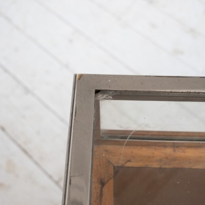 Vitrine en laiton nickelé reposant sur une base en chêne massif.