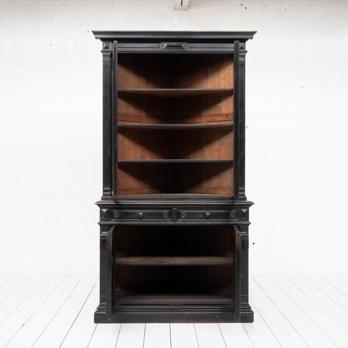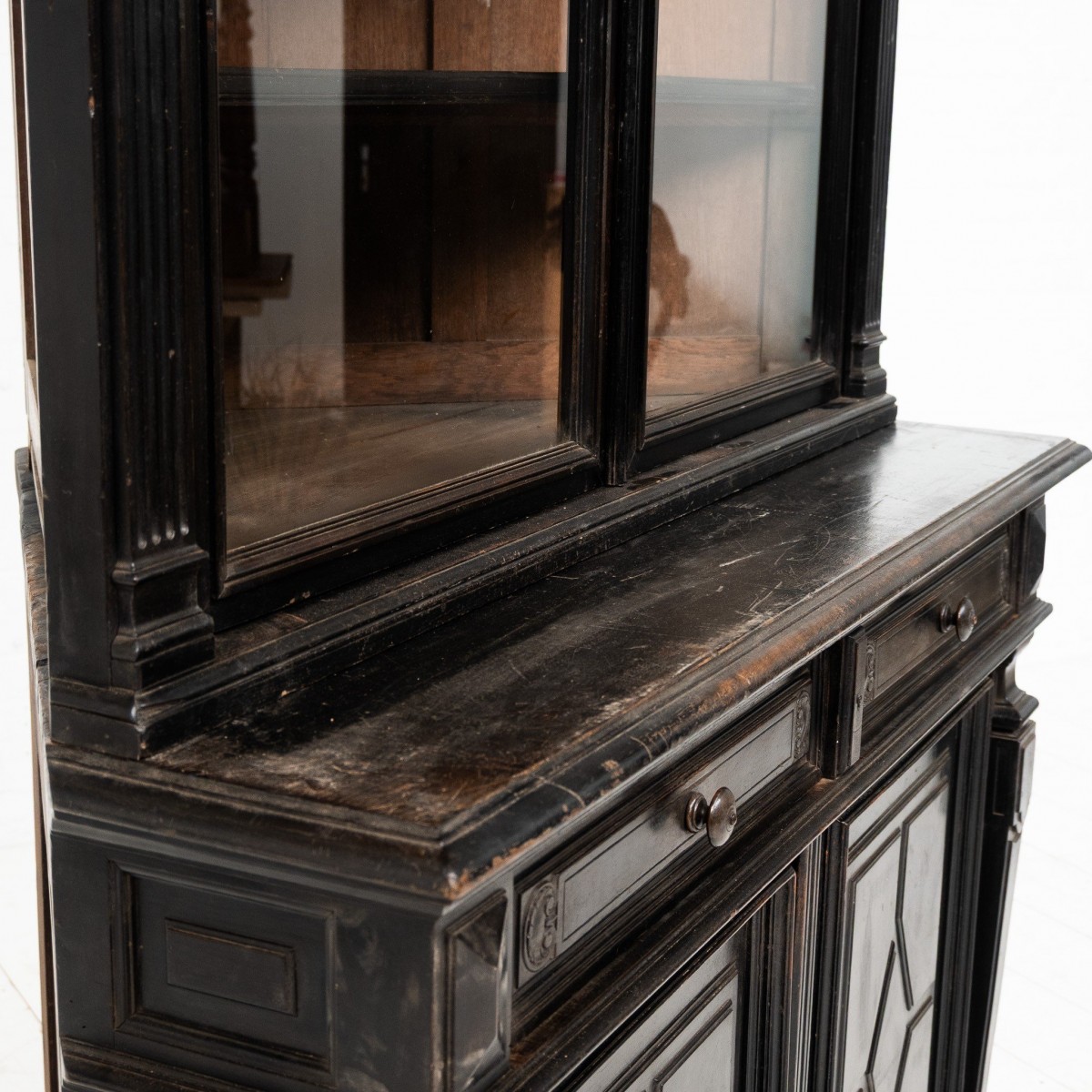 Meuble composé de deux parties reposant sur une structure en chêne et poirier noirci.