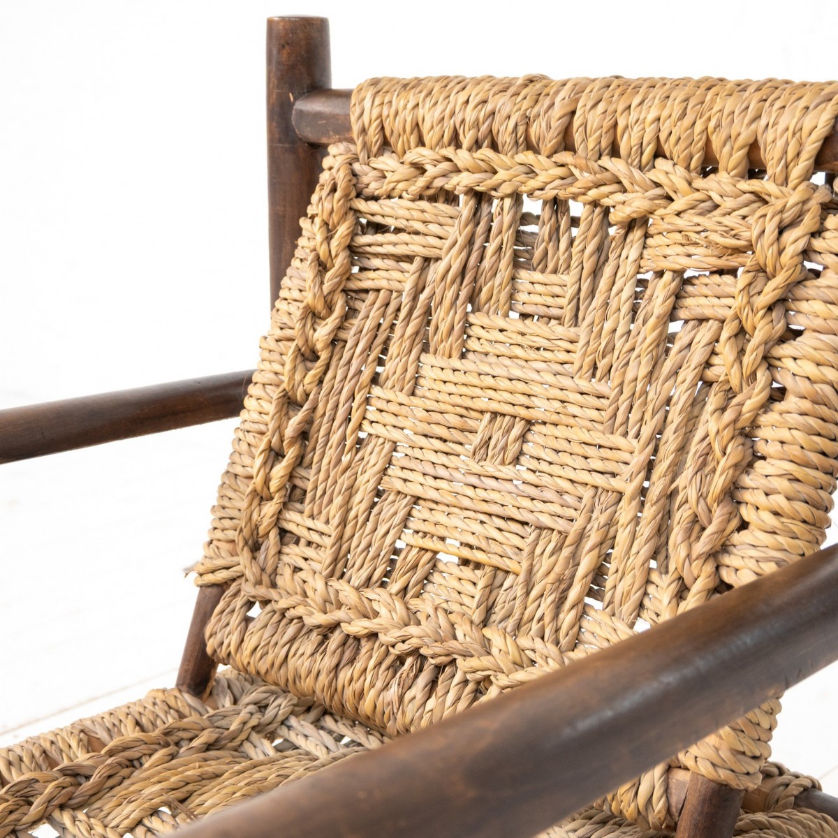Fauteuil AUDOUX MINET à structure en bois et assise et dossier garnis d'un tressage de corde, travail des années 50.