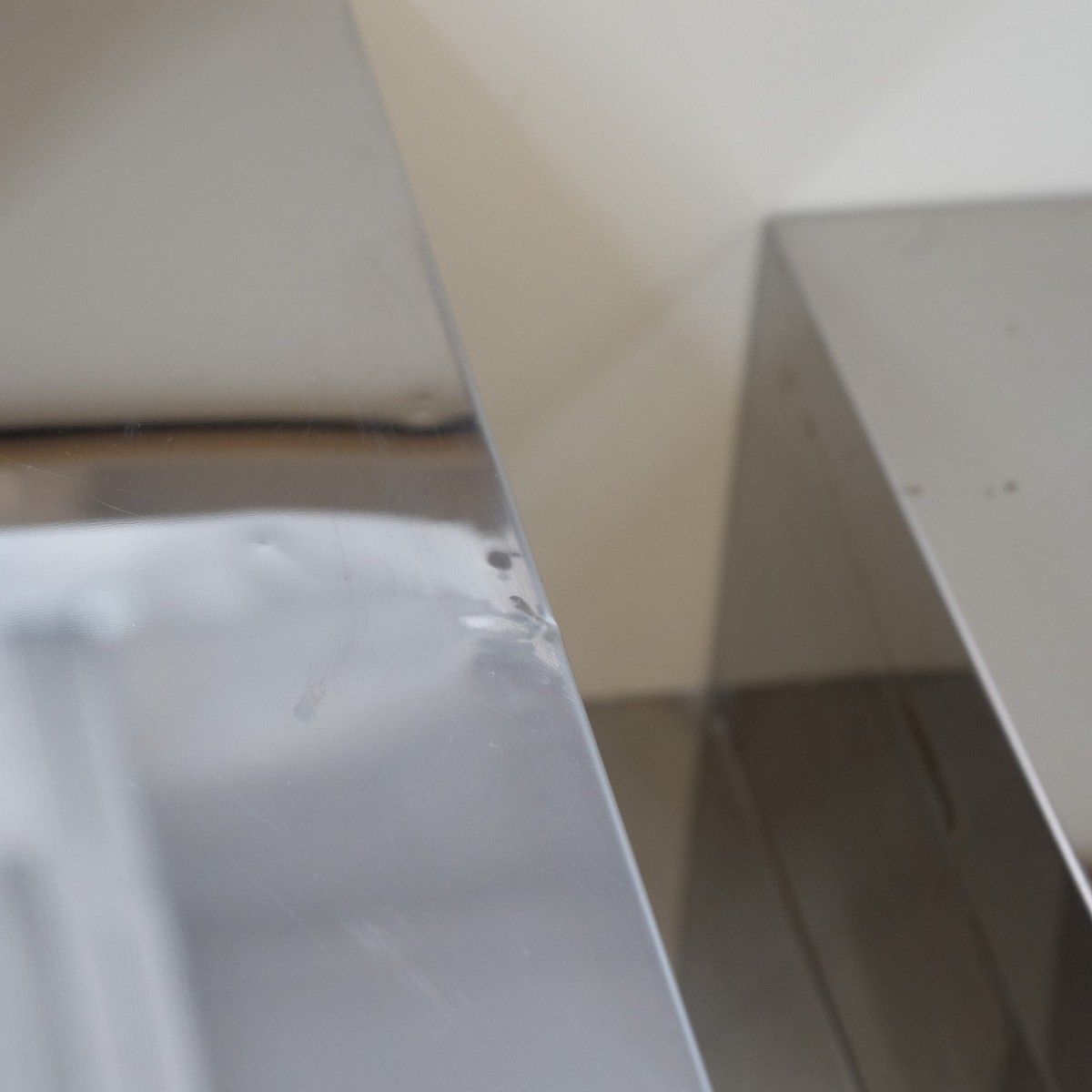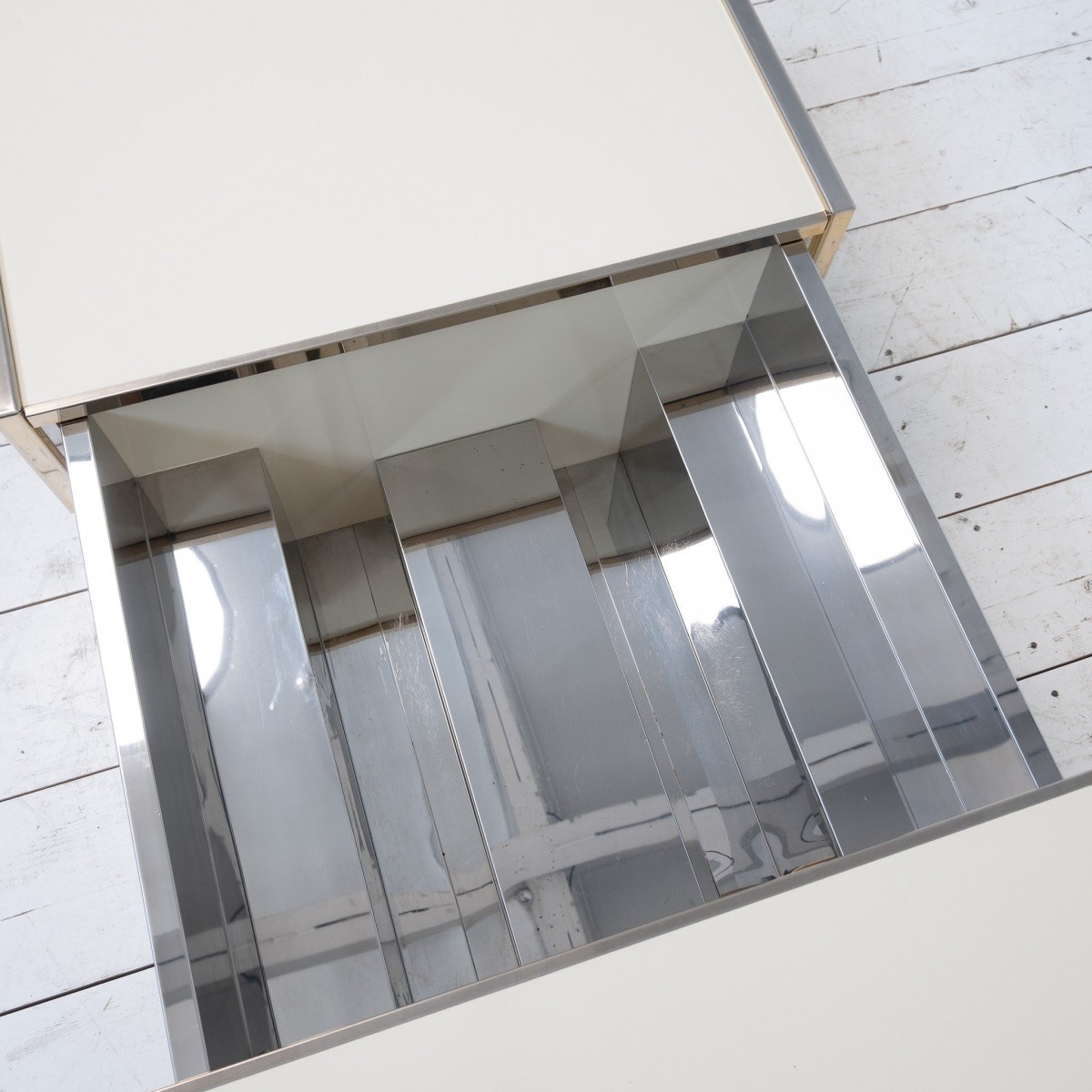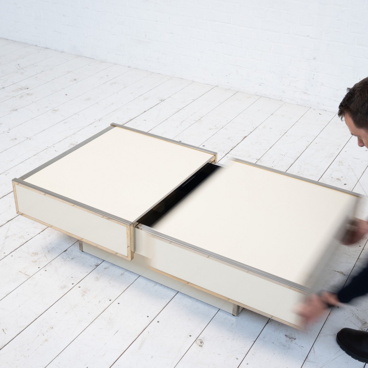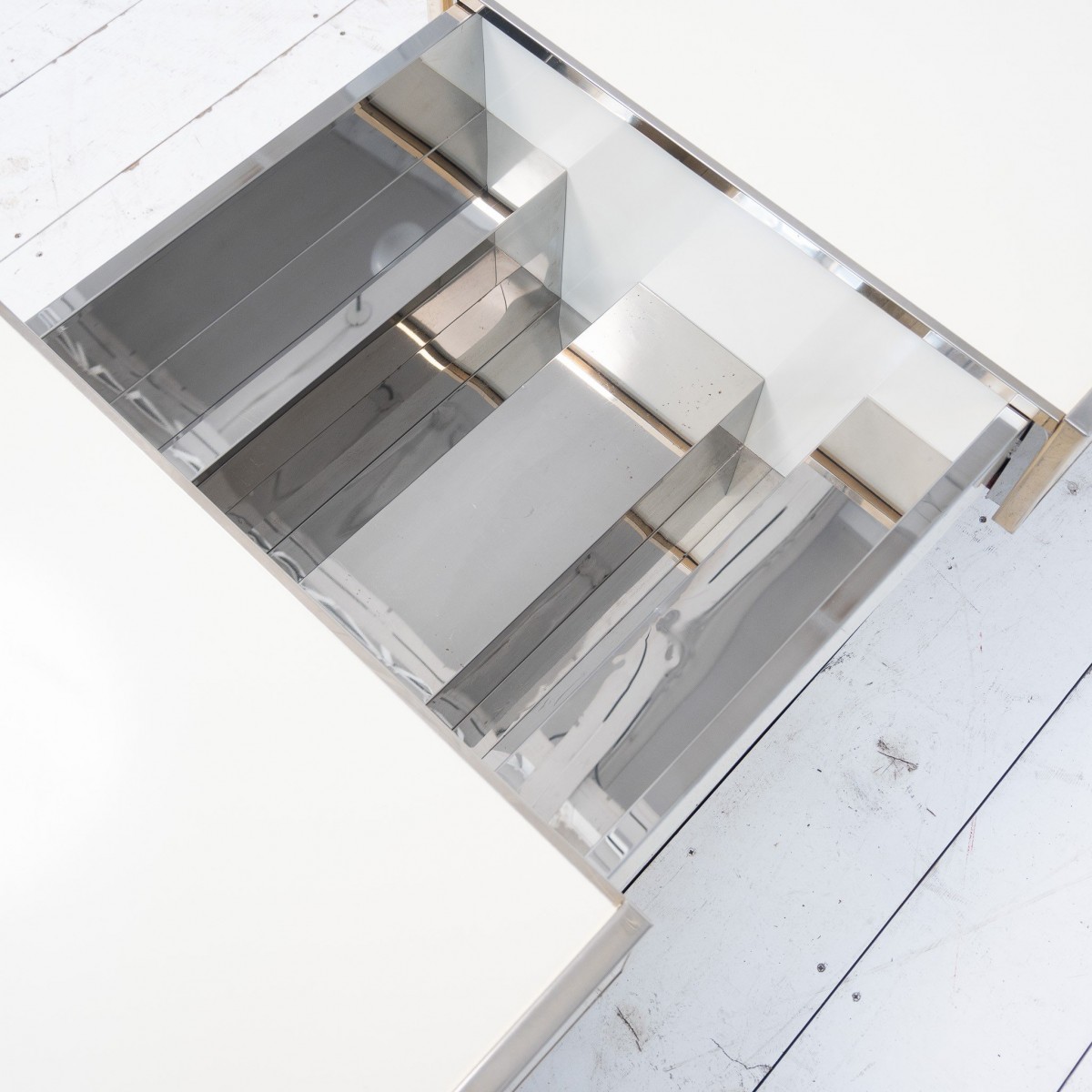 Plateau coulissant laissant apparaître un espace bar en métal chromé.