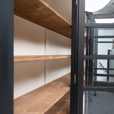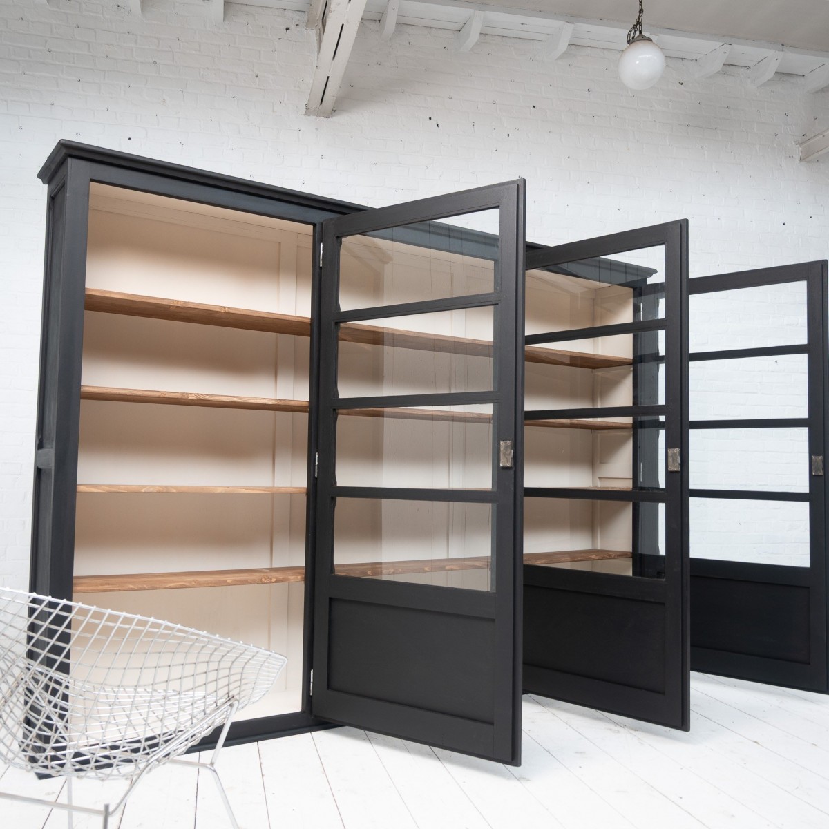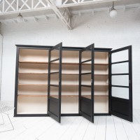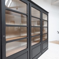 3 portes vitrées fermant à clé ouvrant sur une série d’étagères