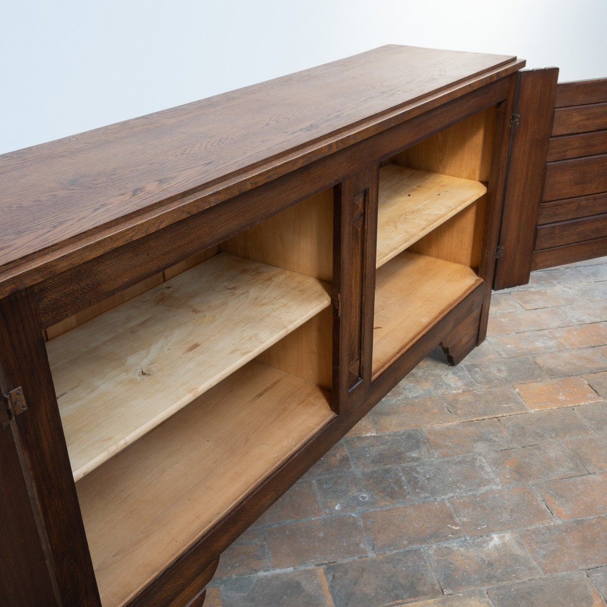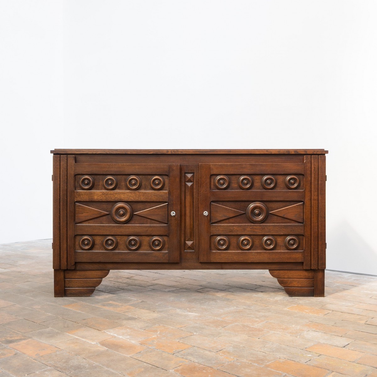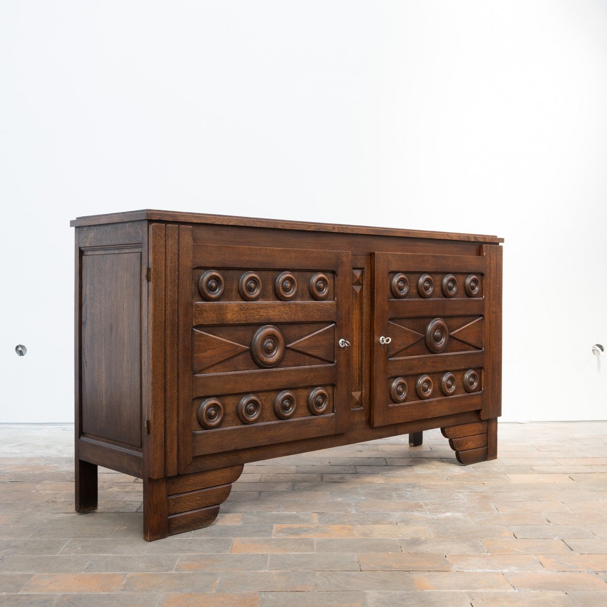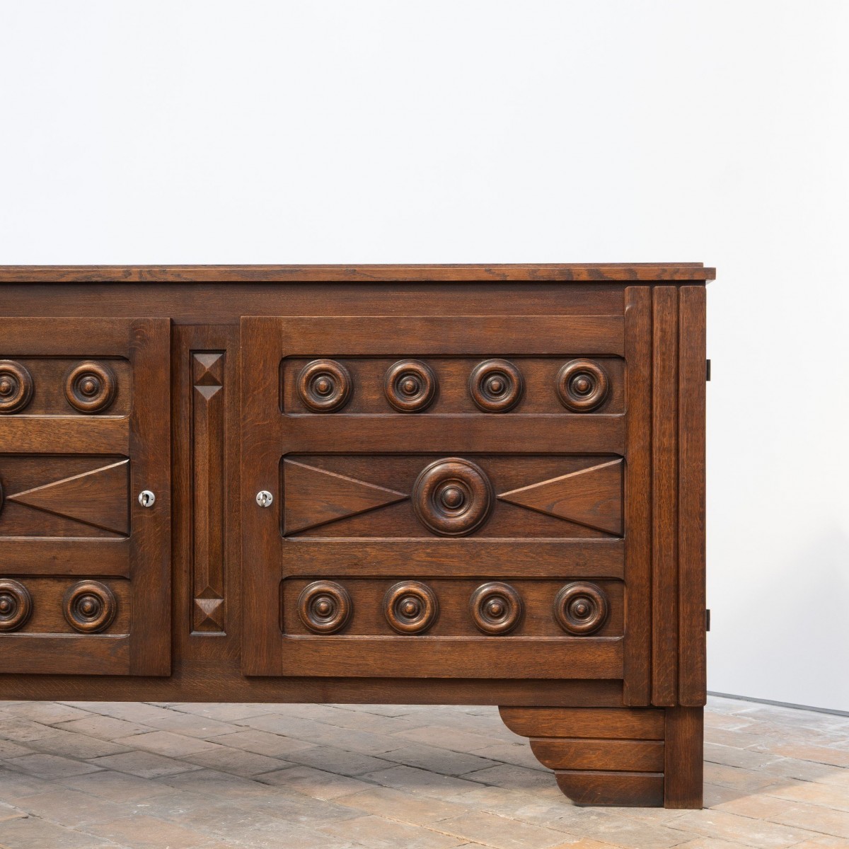 Enfilade en chêne massif ouvrant par deux portes ornées de motifs géométriques.