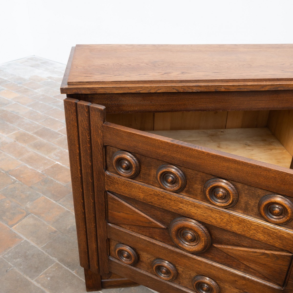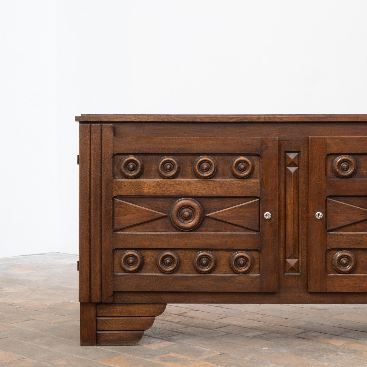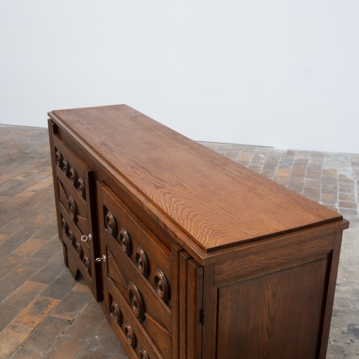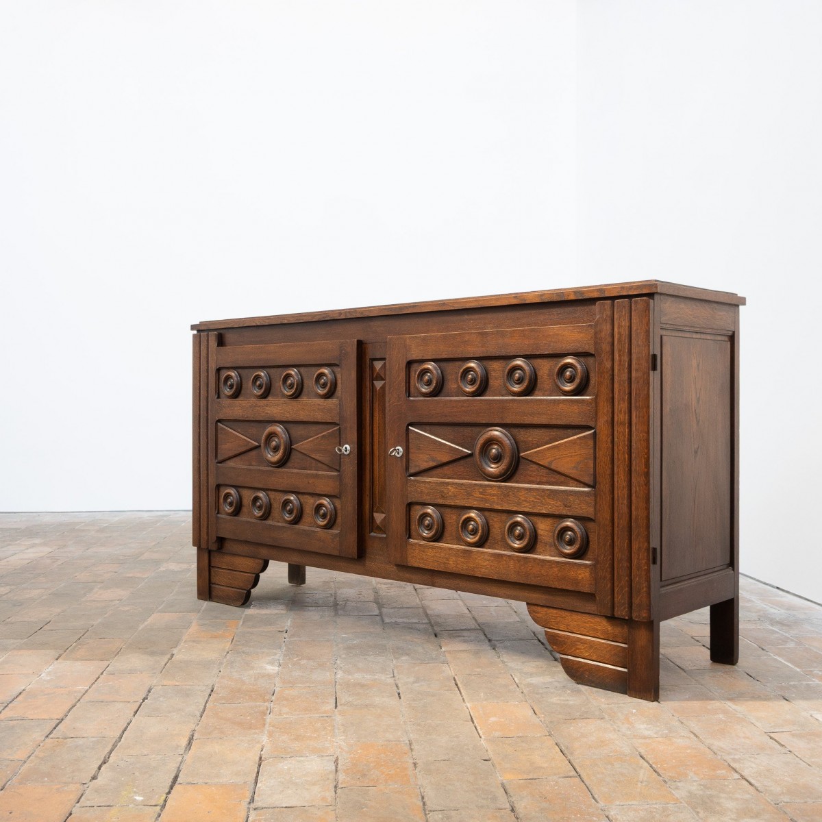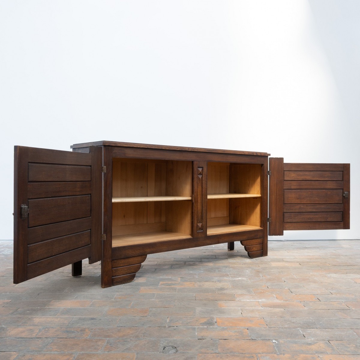 Enfilade en chêne massif ouvrant par deux portes ornées de motifs géométriques.